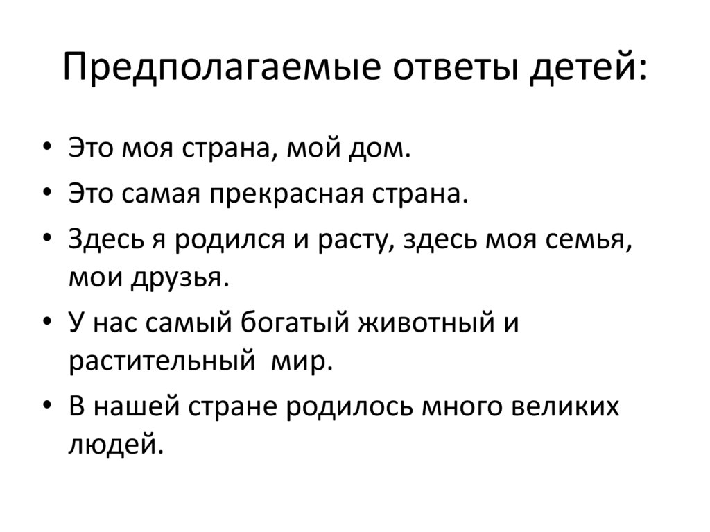 Предполагаемые ответы детей:• Это моя страна, мой дом.