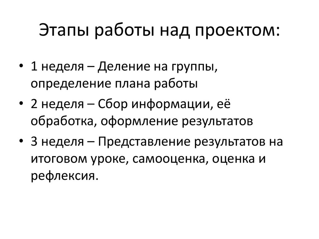 Этапы работы над проектом:• 1 неделя – Деление на группы,