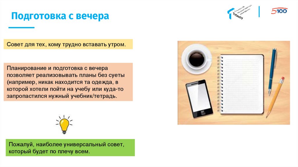 Подготовка с вечераСовет для тех, кому трудно вставать утром.
