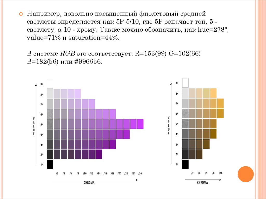 Например, довольно насыщенный фиолетовый среднейсветлоты определяется как 5P 5/10, где 5P означает тон, 5 светлоту, а 10 - хрому. Также можно обозначить, как hue=278°,