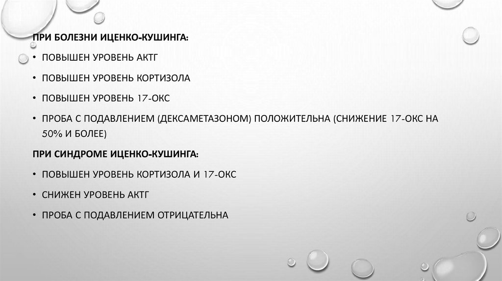 ПРИ БОЛЕЗНИ ИЦЕНКО-КУШИНГА:• ПОВЫШЕН УРОВЕНЬ АКТГ
