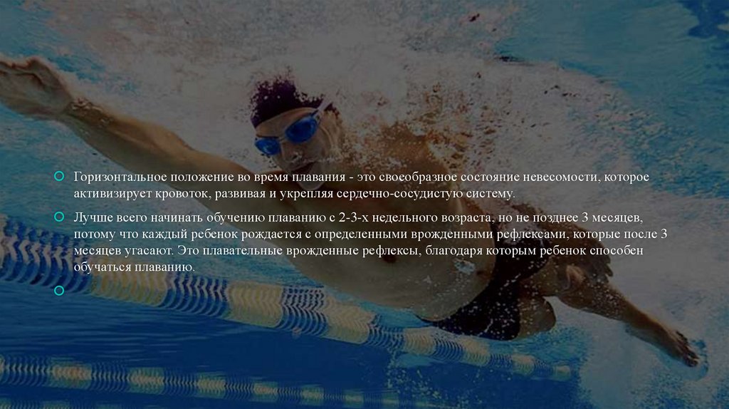 Горизонтальное положение во время плавания - это своеобразное состояние невесомости, котороеактивизирует кровоток, развивая и укрепляя сердечно-сосудистую систему.