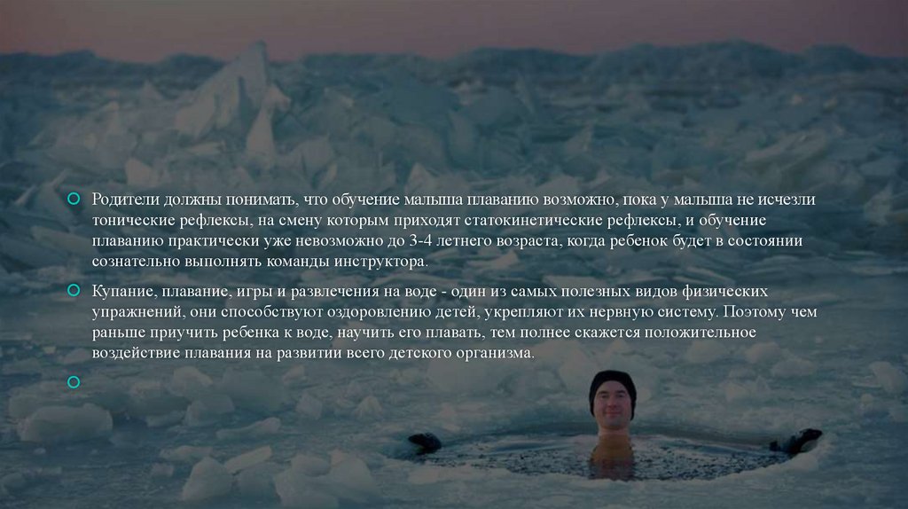Родители должны понимать, что обучение малыша плаванию возможно, пока у малыша не исчезлитонические рефлексы, на смену которым приходят статокинетические рефлексы, и обучение