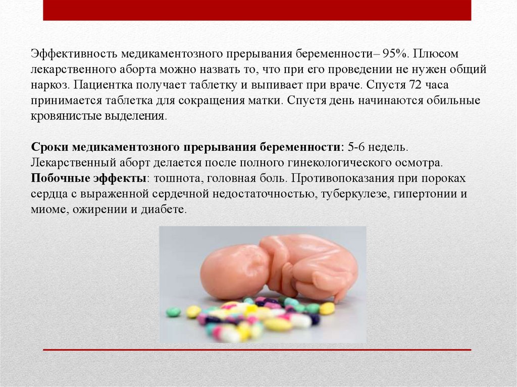 Эффективность медикаментозного прерывания беременности– 95%. Плюсомлекарственного аборта можно назвать то, что при его проведении не нужен общий