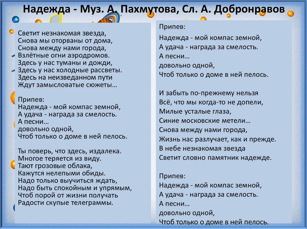 Надежда - Муз. А. Пахмутова, Сл. А. ДобронравовСветит незнакомая звезда,