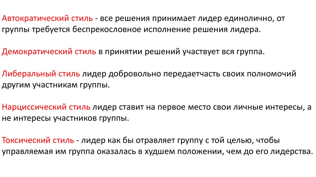 Автократический стиль - все решения принимает лидер единолично, отгруппы требуется беспрекословное исполнение решения лидера.