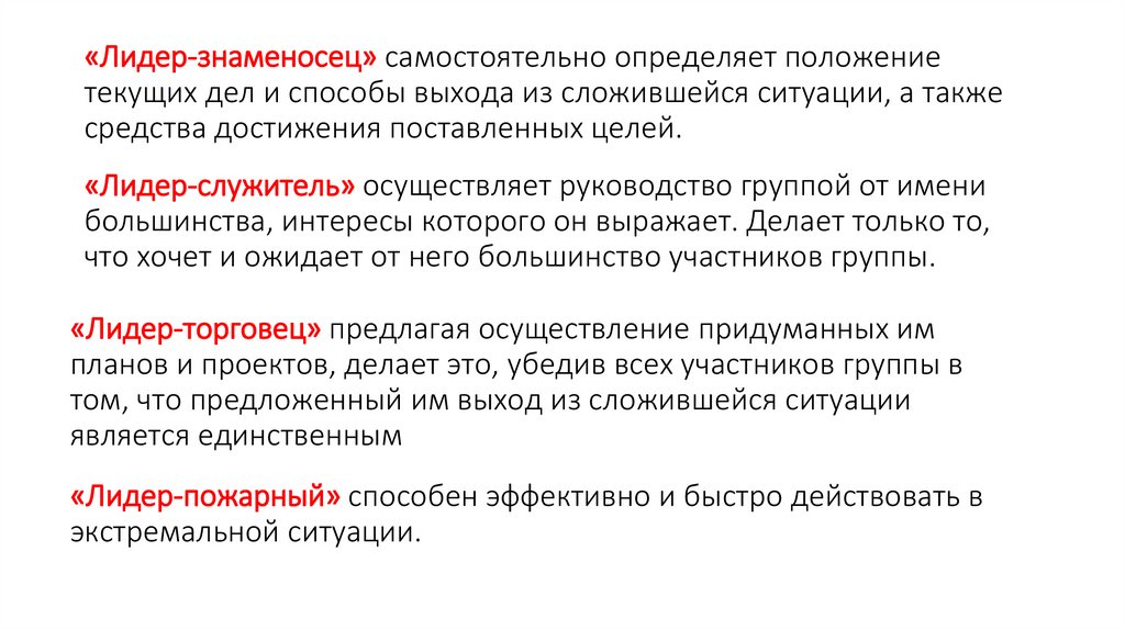 «Лидер-знаменосец» самостоятельно определяет положениетекущих дел и способы выхода из сложившейся ситуации, а также