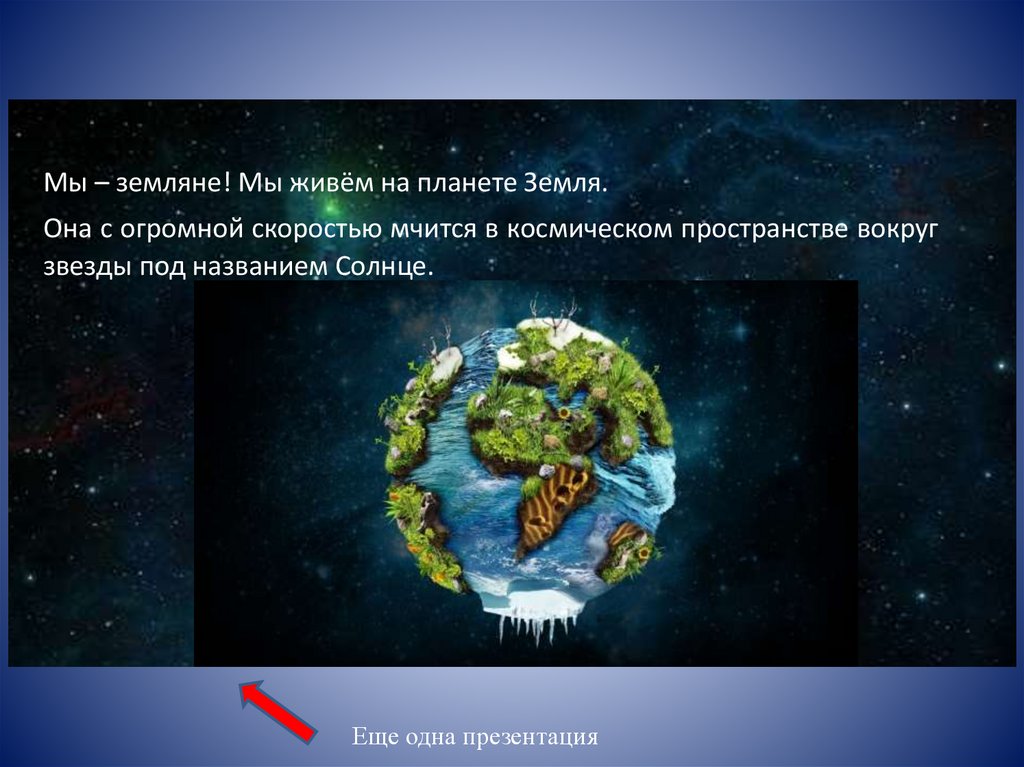 Мы – земляне! Мы живём на планете Земля.Она с огромной скоростью мчится в космическом пространстве вокруг