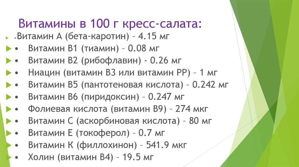 Витамины в 100 г кресс-салата:Витамин А (бета-каротин) – 4.15 мг