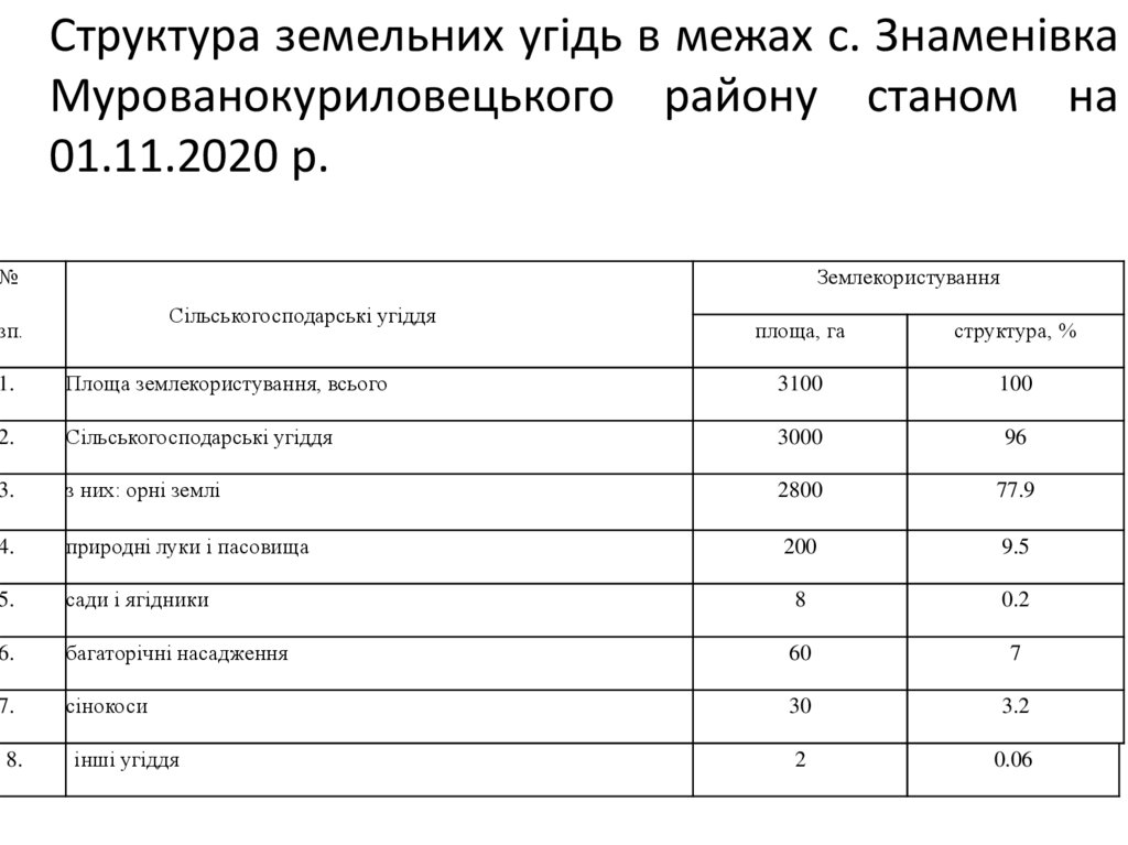 Структура земельних угідь в межах с. ЗнаменівкаМурованокуриловецького району станом на