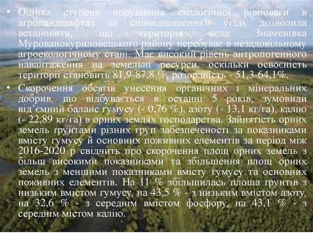 • Оцінка ступеня порушення екологічної рівноваги вагроландшафтах за співвідношенням угідь дозволила