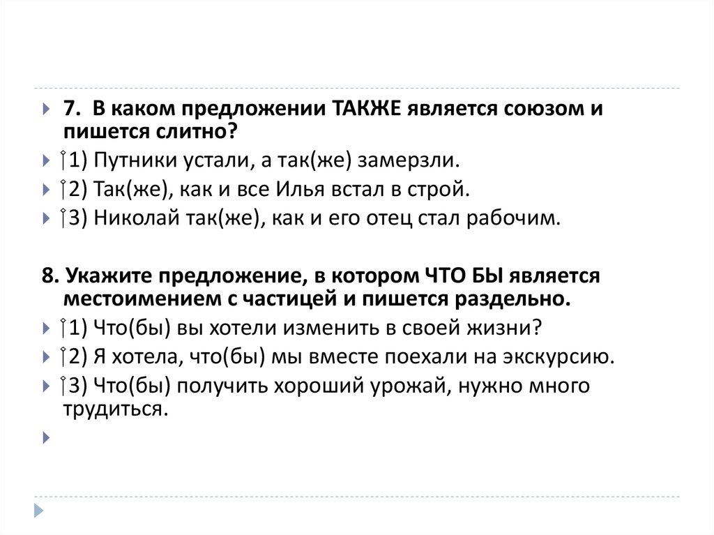 7. В каком предложении ТАКЖЕ является союзом ипишется слитно?