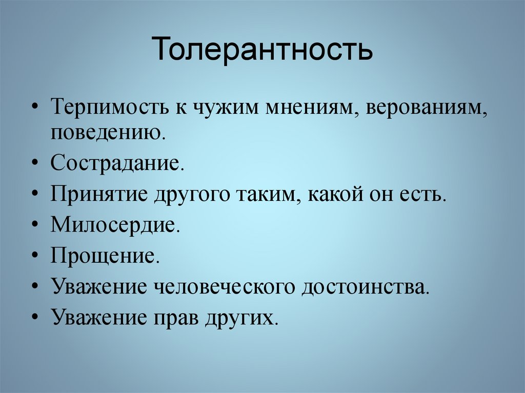 Толерантность• Терпимость к чужим мнениям, верованиям,