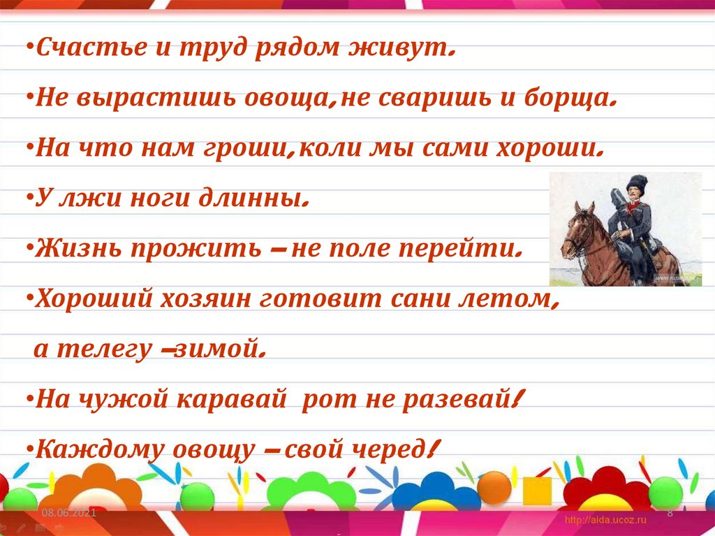 •Счастье и труд рядом живут.•Не вырастишь овоща, не сваришь и борща.