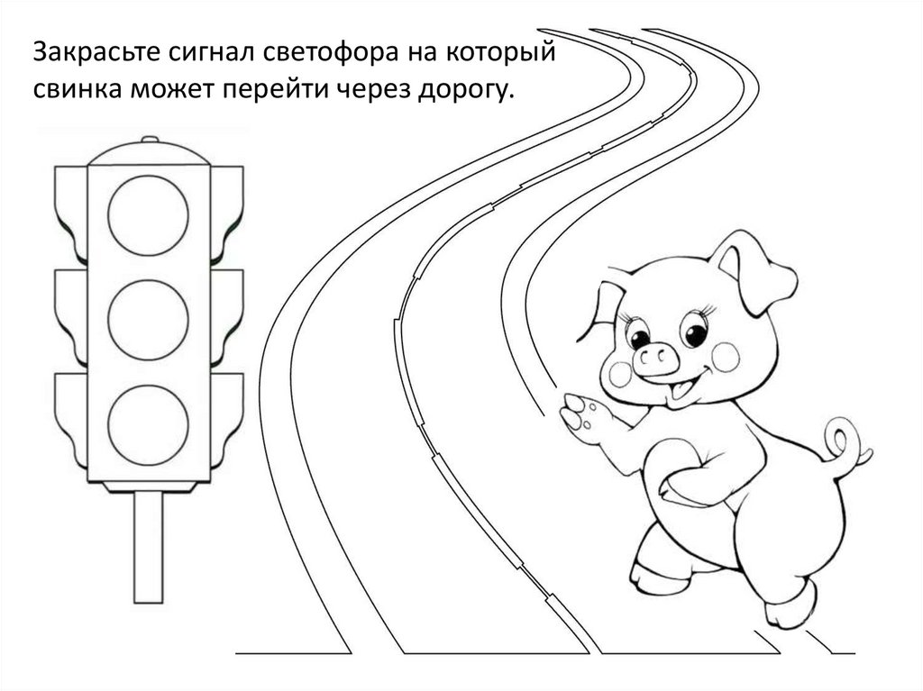 Закрасьте сигнал светофора на которыйсвинка может перейти через дорогу.