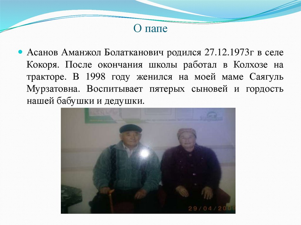 О папеАсанов Аманжол Болатканович родился 27.12.1973г в селе