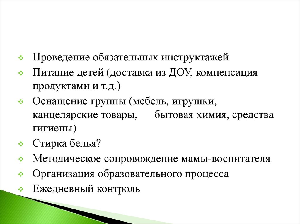 Проведение обязательных инструктажейПитание детей (доставка из ДОУ, компенсация