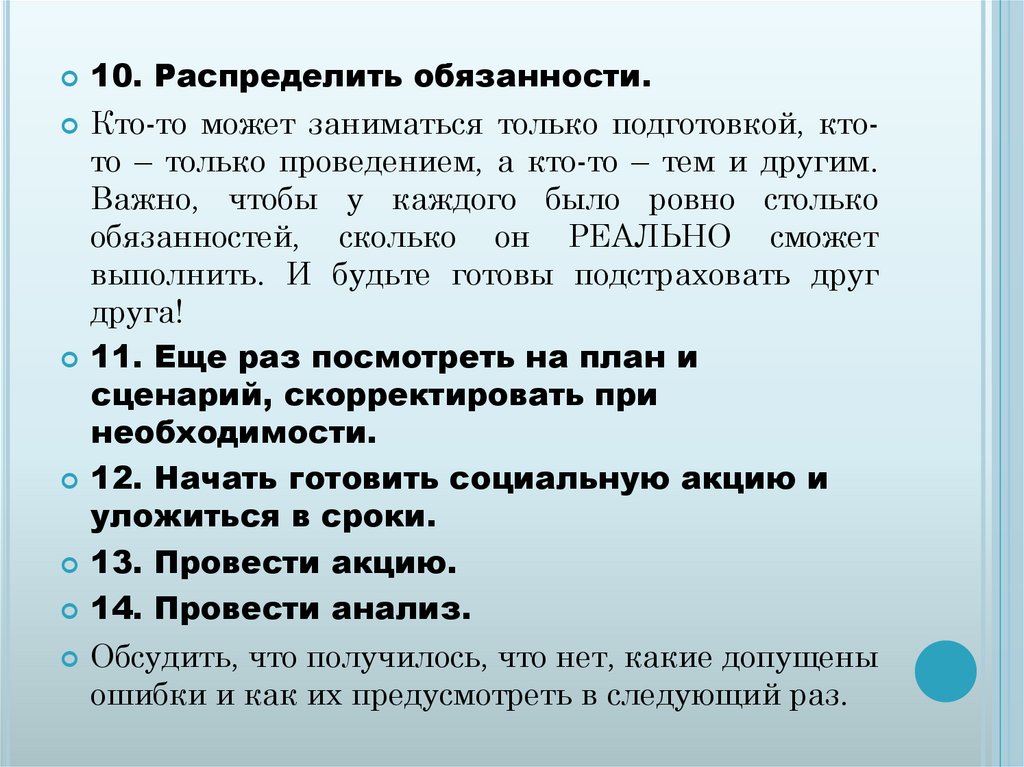 10. Распределить обязанности.Кто-то может заниматься только подготовкой, ктото – только проведением, а кто-то – тем и другим.