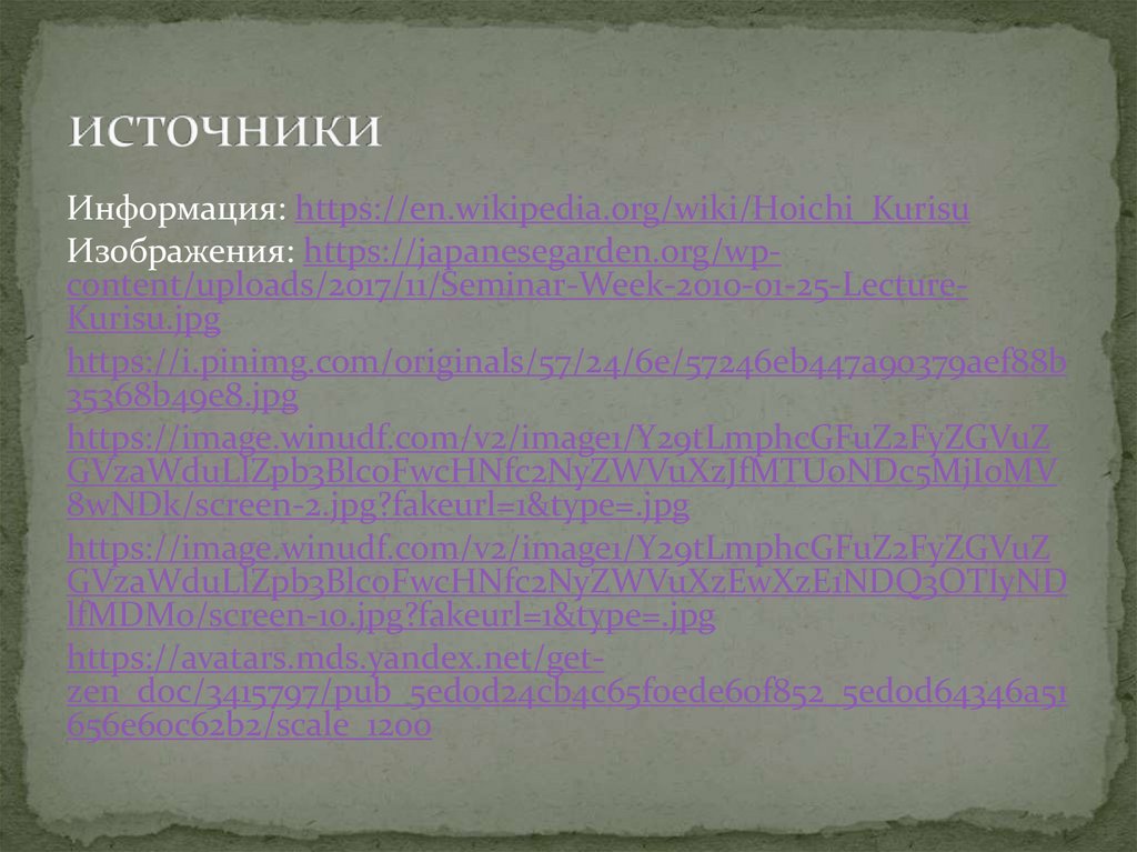 Информация: https://en.wikipedia.org/wiki/Hoichi_KurisuИзображения: https://japanesegarden.org/wpcontent/uploads/2017/11/Seminar-Week-2010-01-25-LectureKurisu.jpg
