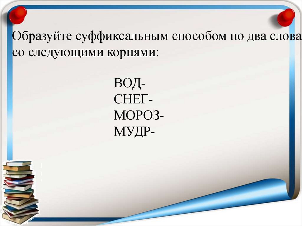 Образуйте суффиксальным способом по два словасо следующими корнями: