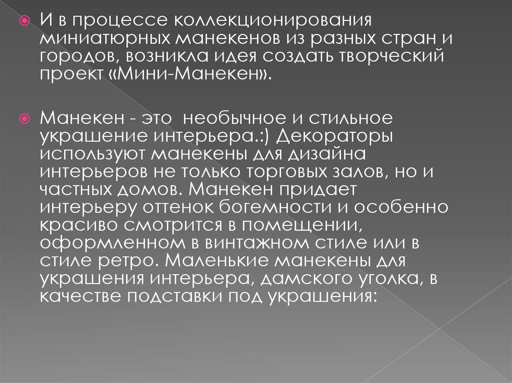 И в процессе коллекционированияминиатюрных манекенов из разных стран и