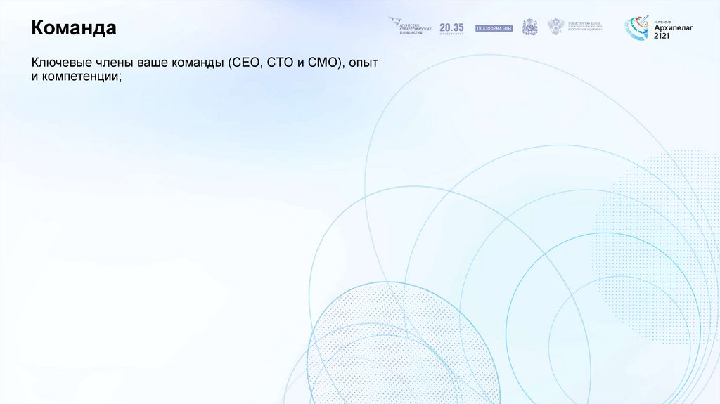 КомандаКлючевые члены ваше команды (CEO, CTO и СMO), опыт