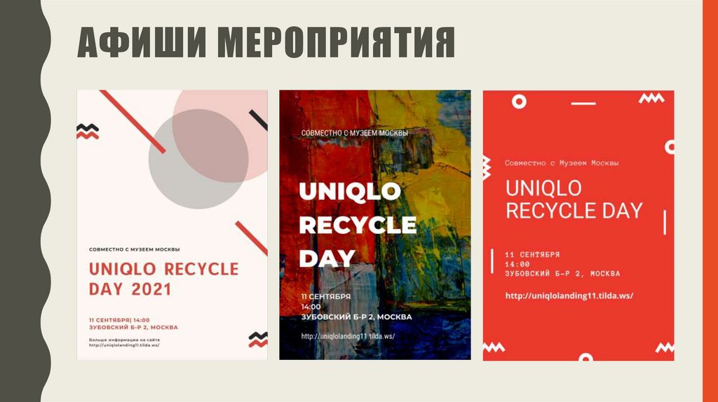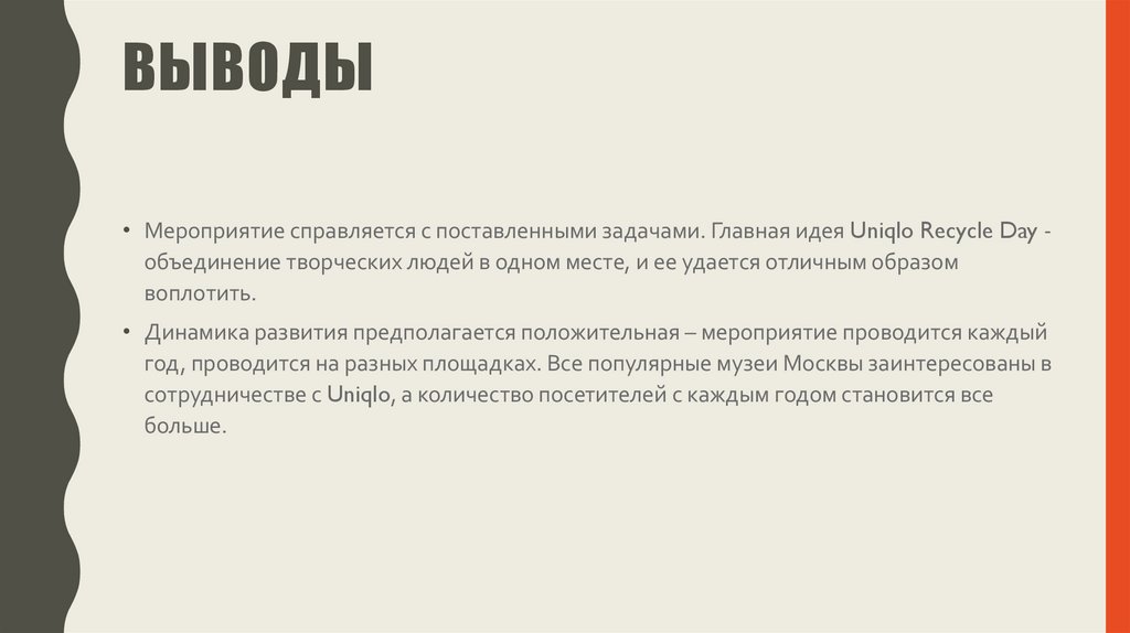 ВЫВОДЫ• Мероприятие справляется с поставленными задачами. Главная идея Uniqlo Recycle Day объединение творческих людей в одном месте, и ее удается отличным образом