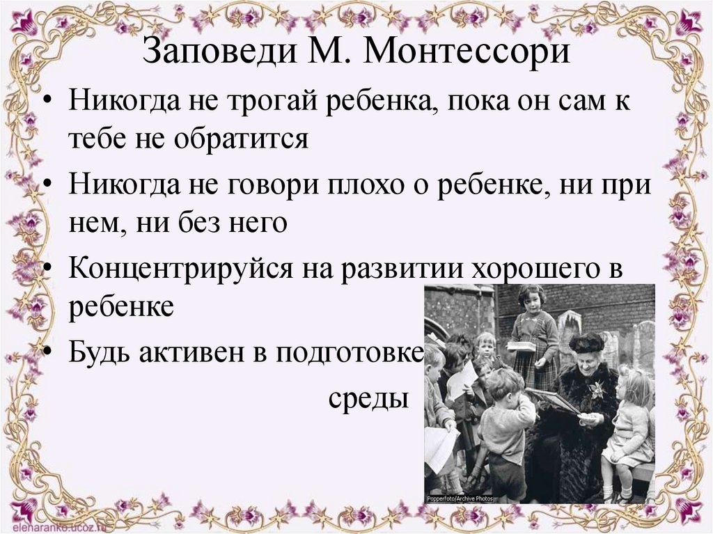 Заповеди М. Монтессори• Никогда не трогай ребенка, пока он сам к
