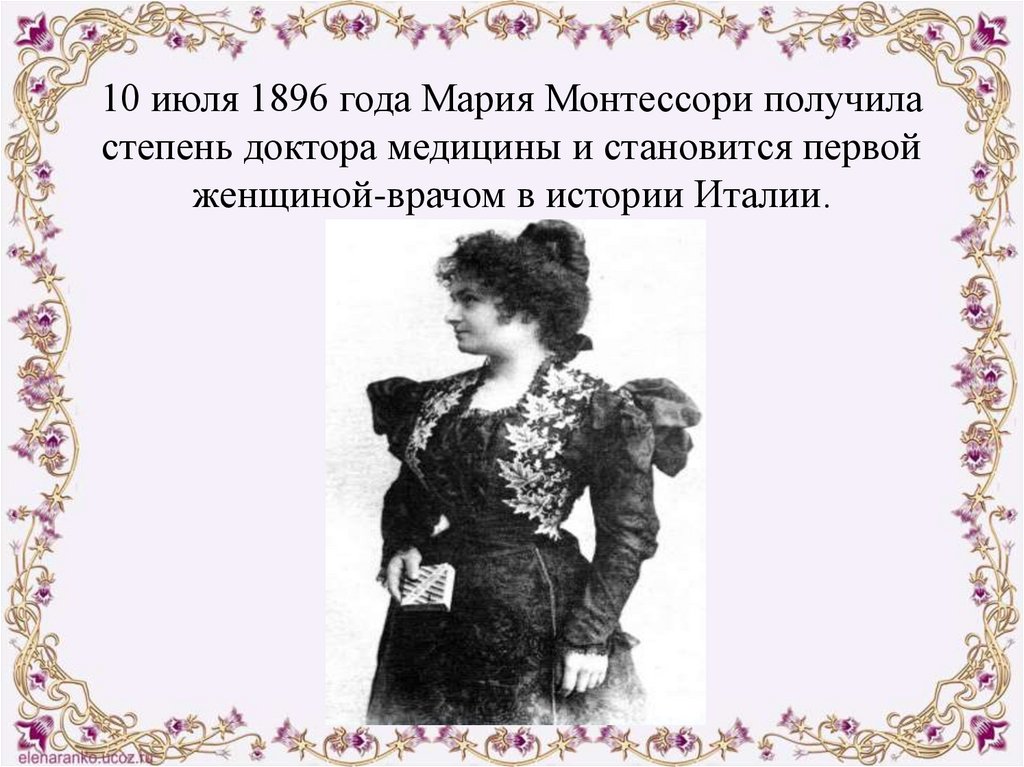 10 июля 1896 года Мария Монтессори получиластепень доктора медицины и становится первой