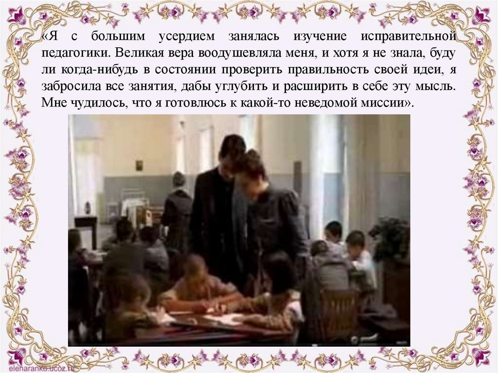 «Я с большим усердием занялась изучение исправительнойпедагогики. Великая вера воодушевляла меня, и хотя я не знала, буду