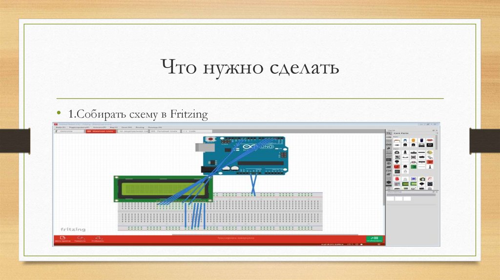 Что нужно сделать• 1.Собирать схему в Fritzing