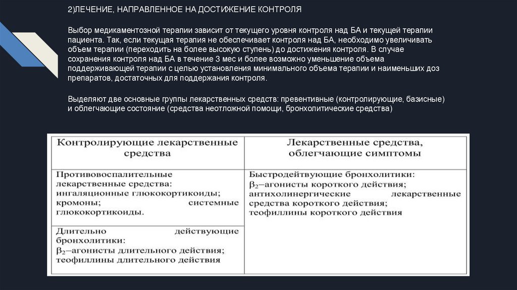 2)ЛЕЧЕНИЕ, НАПРАВЛЕННОЕ НА ДОСТИЖЕНИЕ КОНТРОЛЯВыбор медикаментозной терапии зависит от текущего уровня контроля над БА и текущей терапии