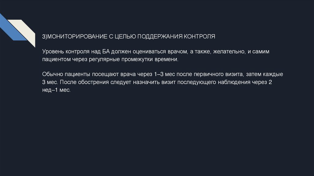 3)МОНИТОРИРОВАНИЕ С ЦЕЛЬЮ ПОДДЕРЖАНИЯ КОНТРОЛЯУровень контроля над БА должен оцениваться врачом, а также, желательно, и самим