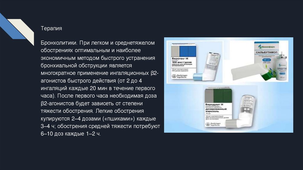 ТерапияБронхолитики. При легком и среднетяжелом