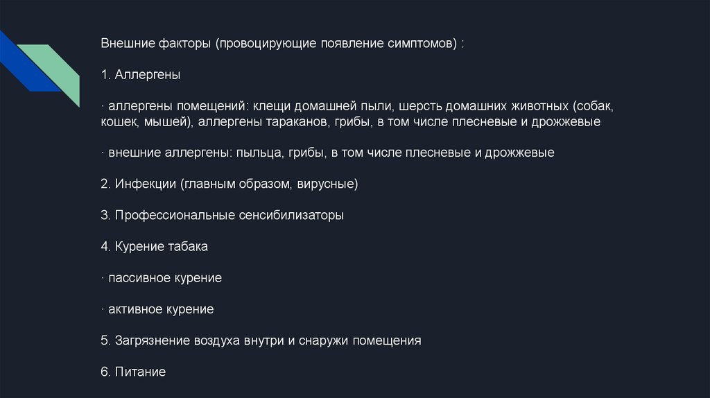 Внешние факторы (провоцирующие появление симптомов) :1. Аллергены