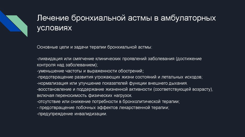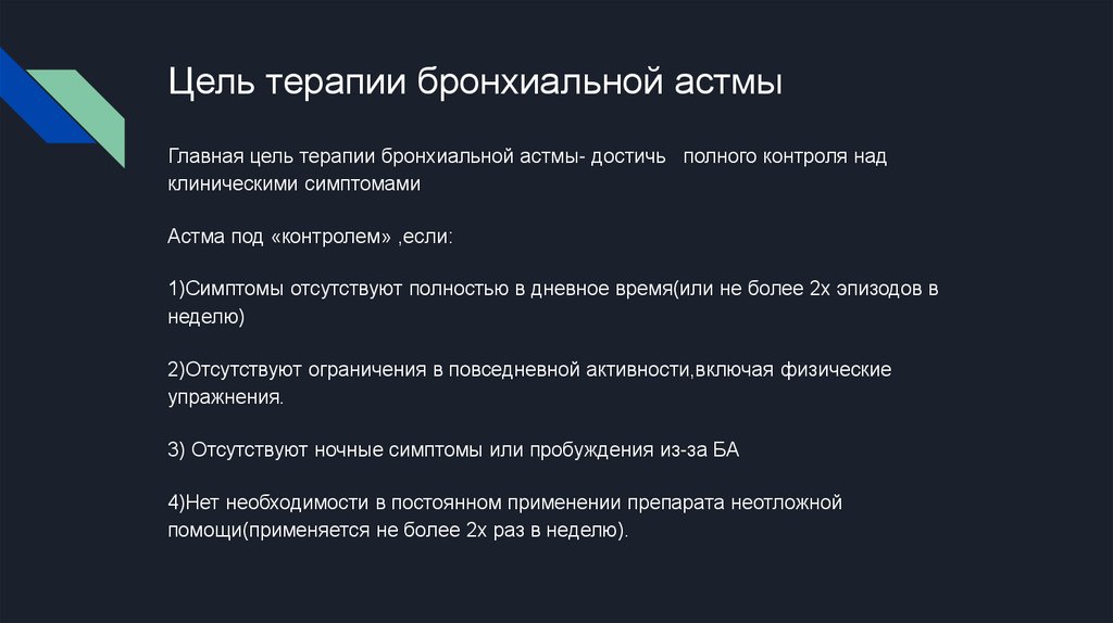 Основные цели и задачи терапии бронхиальной астмы: