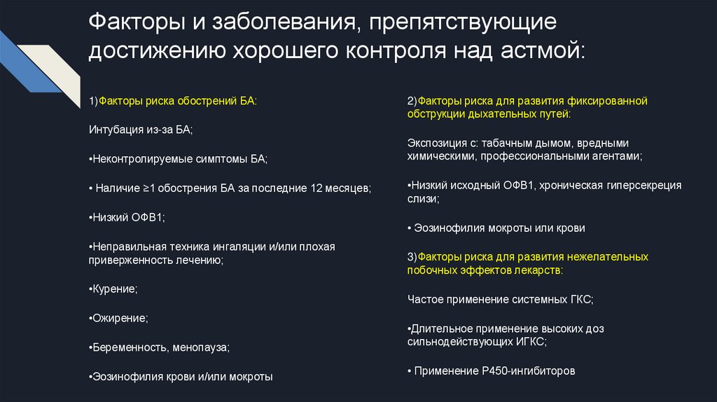 Факторы и заболевания, препятствующиедостижению хорошего контроля над астмой:
