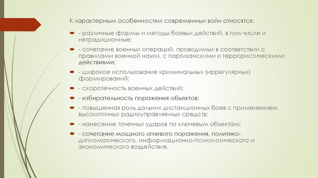 К характерным особенностям современных войн относятся:- различные формы и методы боевых действий, в том числе и