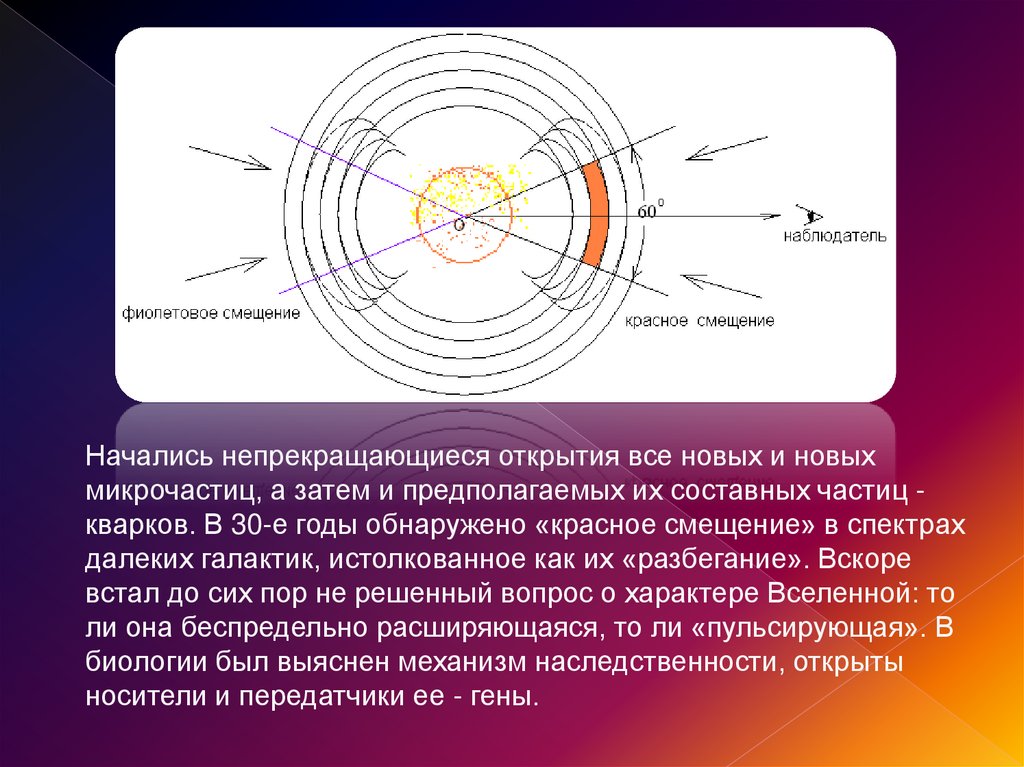 Начались непрекращающиеся открытия все новых и новыхмикрочастиц, а затем и предполагаемых их составных частиц кварков. В 30-е годы обнаружено «красное смещение» в спектрах