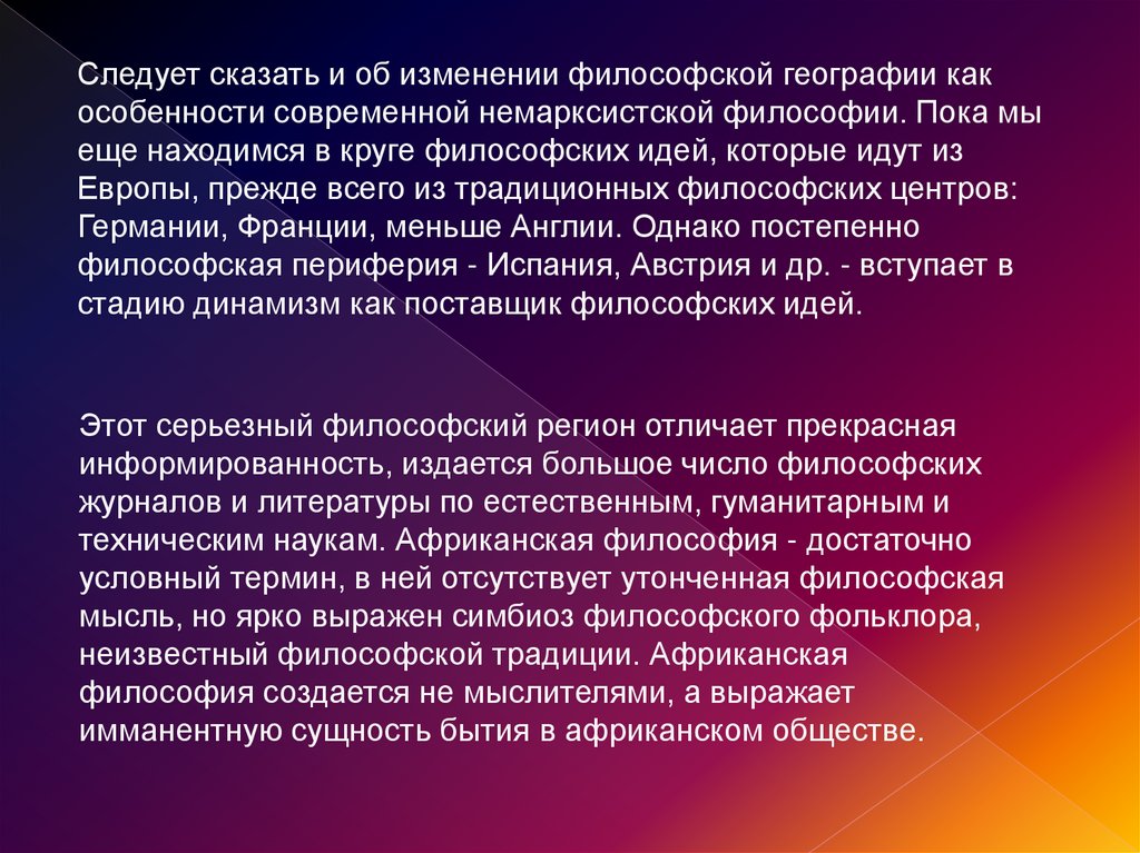 Следует сказать и об изменении философской географии какособенности современной немарксистской философии. Пока мы