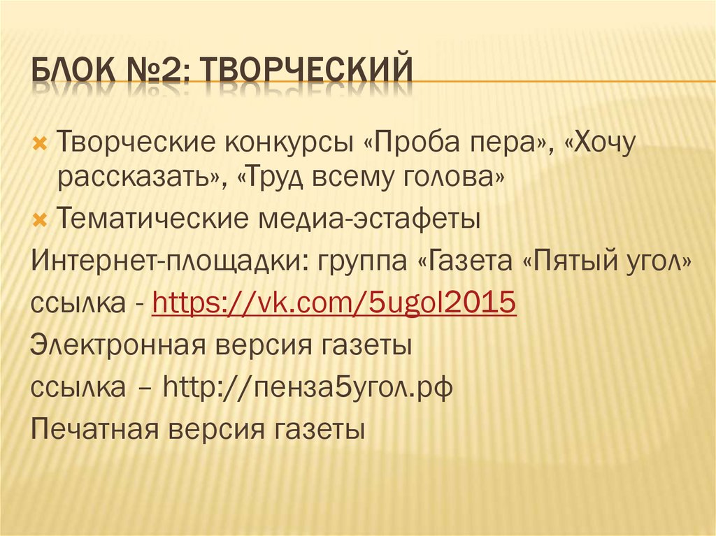 БЛОК №2: ТВОРЧЕСКИЙТворческие конкурсы «Проба пера», «Хочу