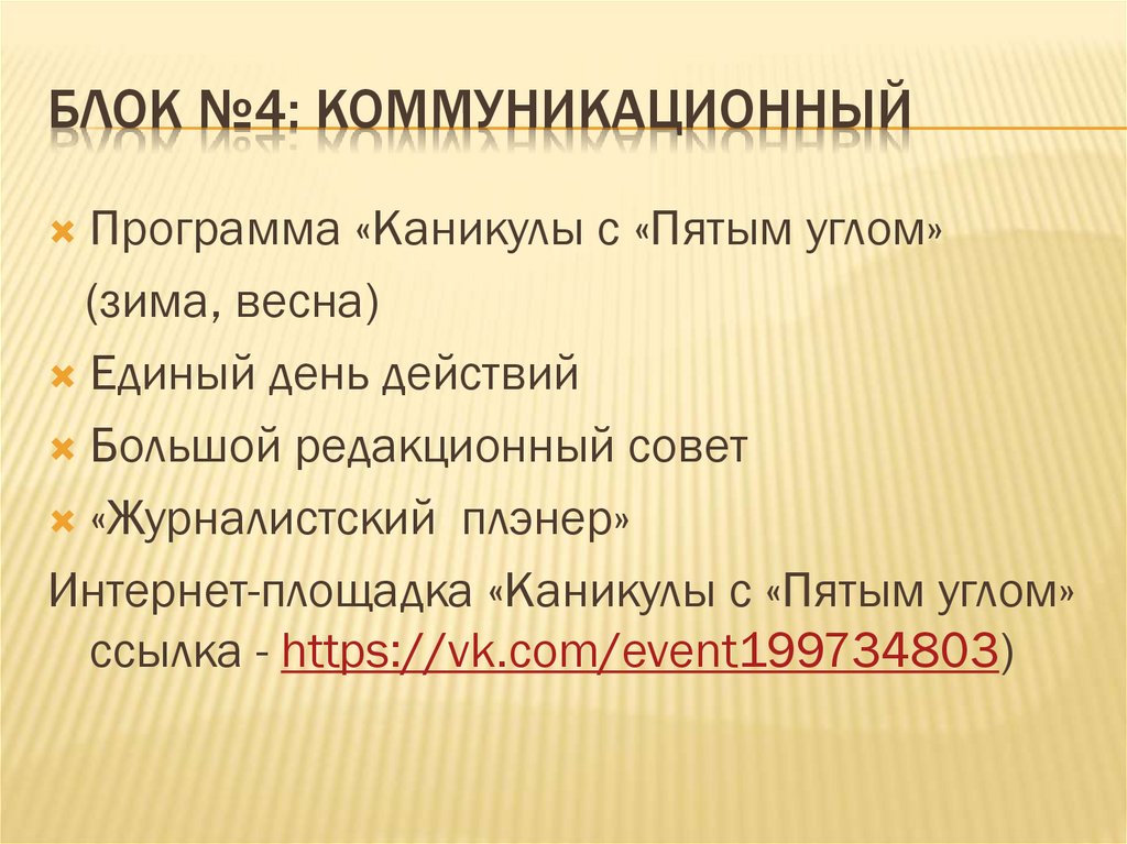 БЛОК №4: КОММУНИКАЦИОННЫЙПрограмма «Каникулы с «Пятым углом»