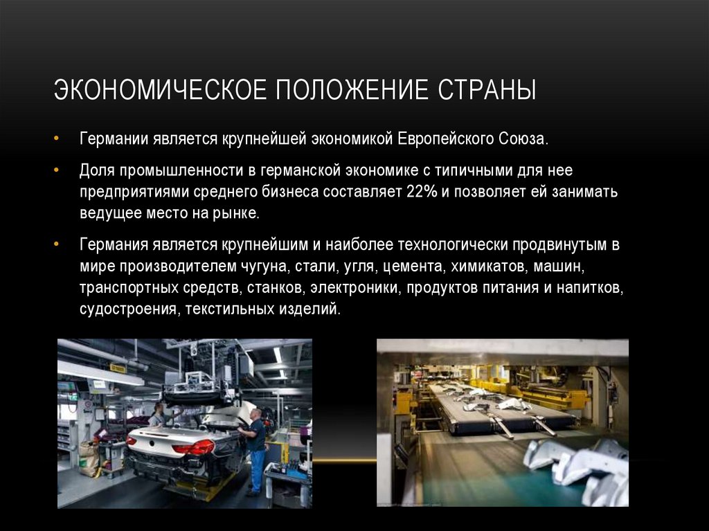 ЭКОНОМИЧЕСКОЕ ПОЛОЖЕНИЕ СТРАНЫГермании является крупнейшей экономикой Европейского Союза.
