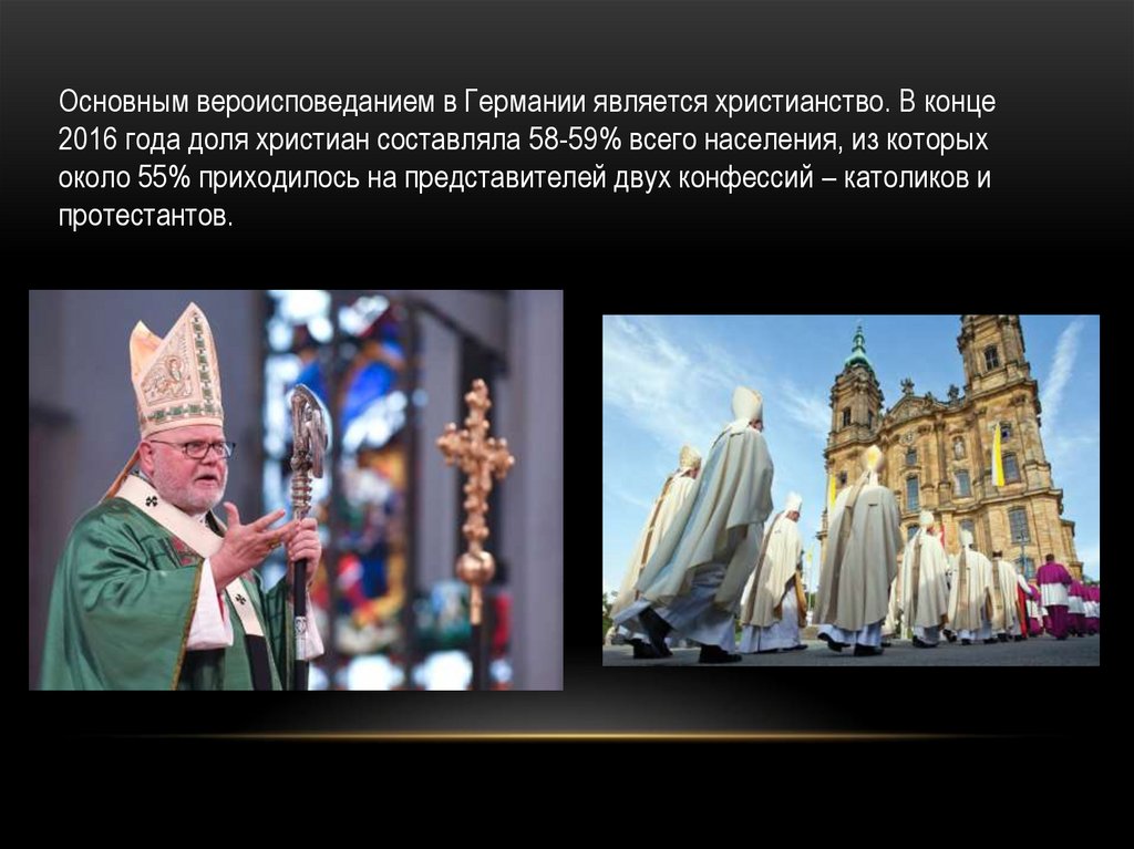 Основным вероисповеданием в Германии является христианство. В конце2016 года доля христиан составляла 58-59% всего населения, из которых