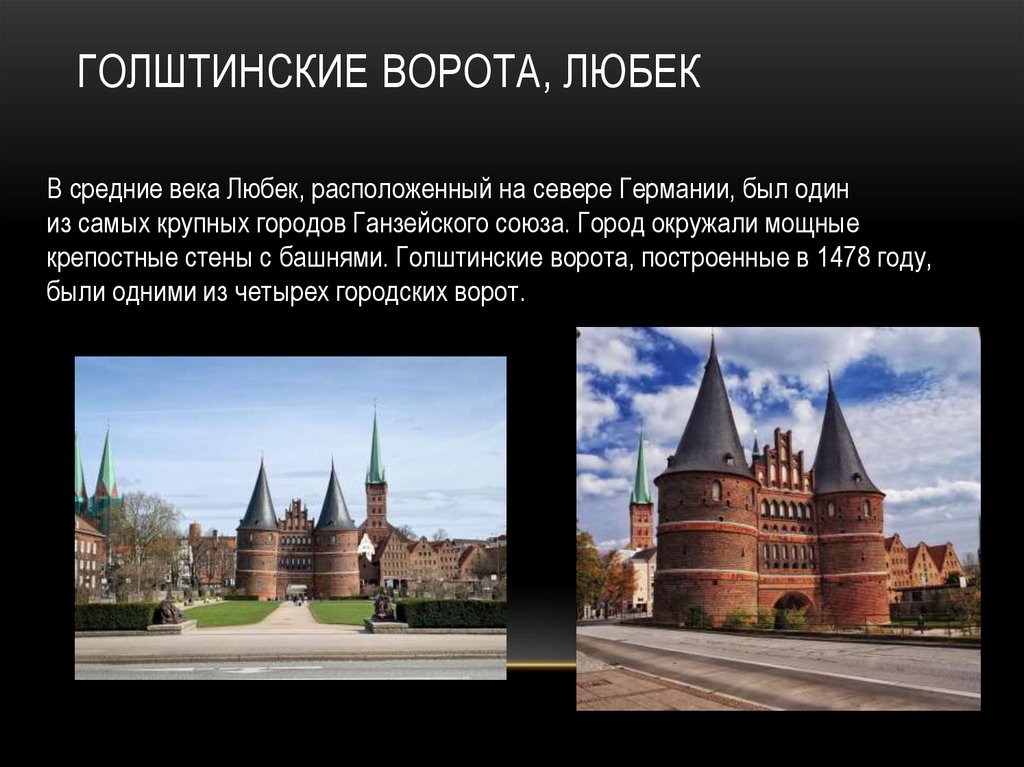 ГОЛШТИНСКИЕ ВОРОТА, ЛЮБЕКВ средние века Любек, расположенный на севере Германии, был один