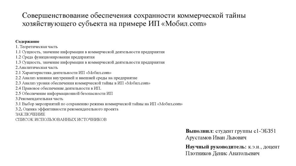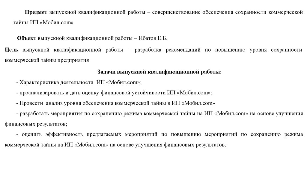 Предмет выпускной квалификационной работы – совершенствование обеспечения сохранности коммерческойтайны ИП «Мобил.com»