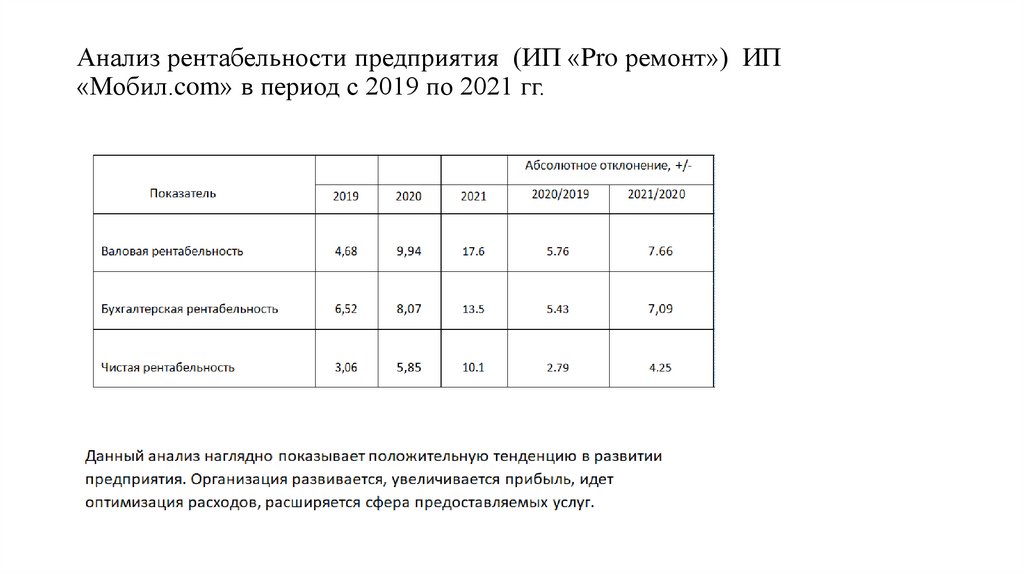 Анализ рентабельности предприятия (ИП «Pro ремонт») ИП«Мобил.com» в период с 2019 по 2021 гг.