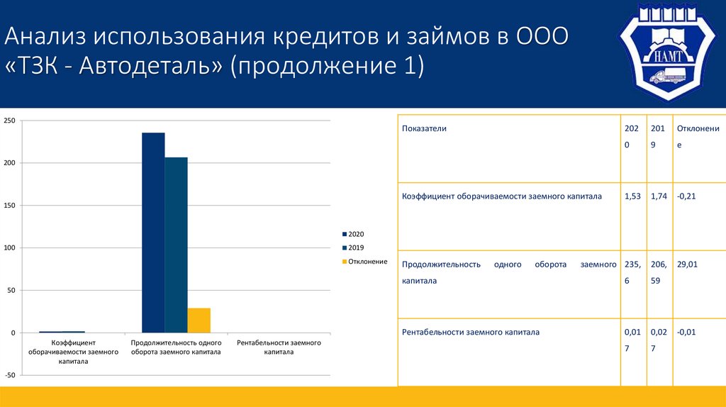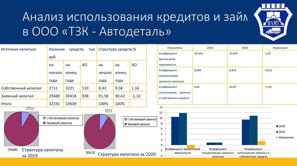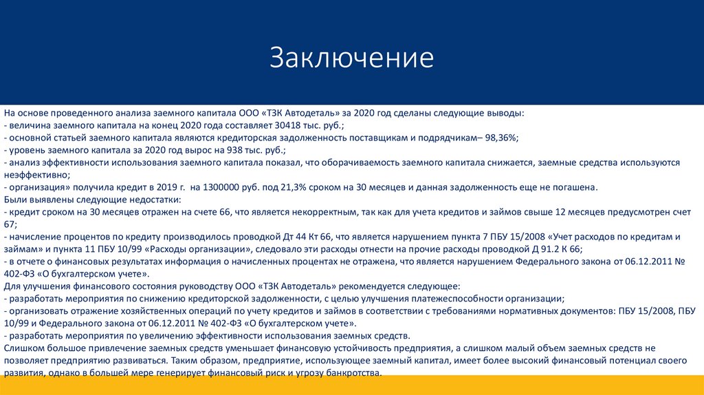 ЗаключениеНа основе проведенного анализа заемного капитала ООО «ТЗК Автодеталь» за 2020 год сделаны следующие выводы: