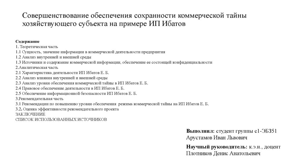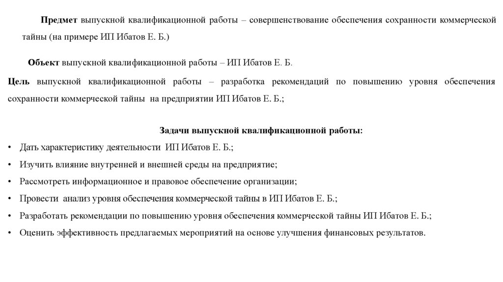 Предмет выпускной квалификационной работы – совершенствование обеспечения сохранности коммерческойтайны (на примере ИП Ибатов Е. Б.)