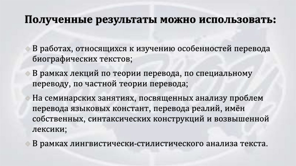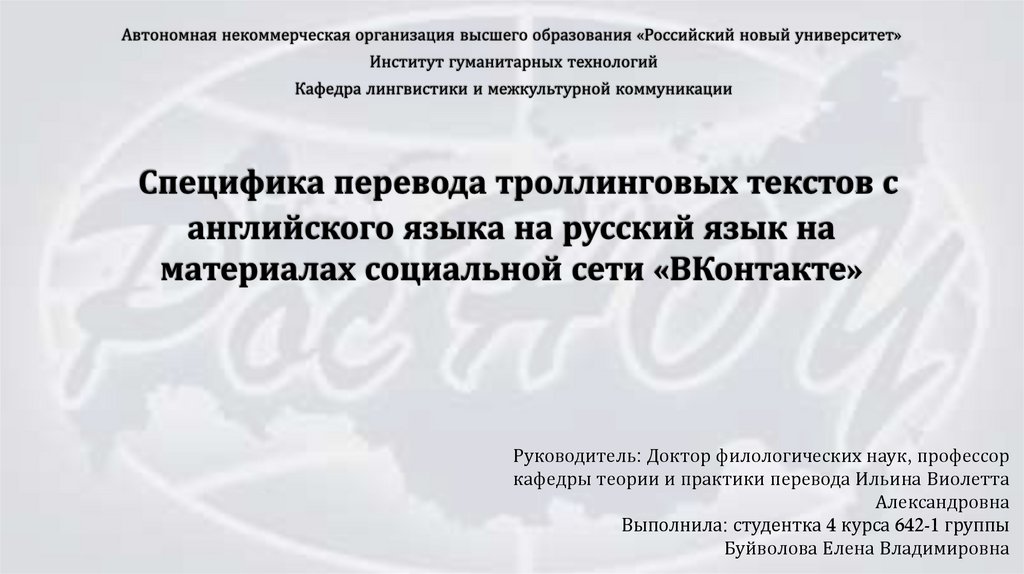 Руководитель: Доктор филологических наук, профессоркафедры теории и практики перевода Ильина Виолетта